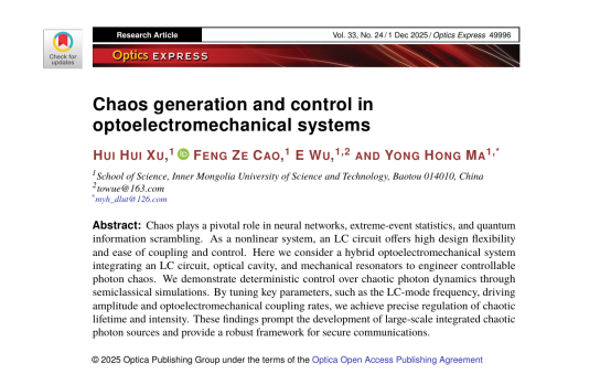 近日,物理学专业硕士研究生徐慧慧同学以第一作者身份在国际光学权威期刊《Optics Express》(中科院二区,影响因子3.3)上发表了题为“Chaos generation and control in optoelectromechanical systems”的学术论文,通讯作者为我院马永红教授。9728太阳集团为论文唯一单位和通讯单位。《Optics Express》是Optica Publishing Group主办的光学学术期刊之一,主要发表光学与光子学所有分支领域的高水平前沿学术成果,覆盖光学材料与器件制备技术、光学成像与传感系统开发、光纤通信及光子集成电路、量子信息处理、量子测量与传感等关键领域,是国际光学界广泛认可的享有高度学术声誉的期刊之一。